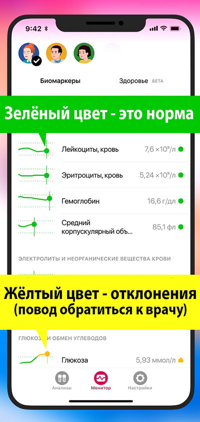 Ornament представляет собой мобильную систему контроля здоровья, доступную прямо на вашем телефоне. Приложение распознает более 2900 биомаркеров и сравнивает ваши показатели с нормальными значениями для вашего пола и возраста. Отклонения от нормы выделяются желтым цветом, что позволяет быстро их заметить на фоне нормальных показателей, обозначенных зеленым. Показатели, выделенные желтым, сигнализируют о возможных проблемах со здоровьем, и в таких случаях рекомендуется проконсультироваться со специалистом.