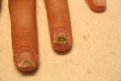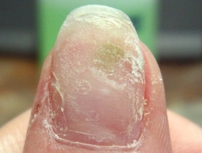 У мужчин заболевание проявляется в рабочей сфере: пекари, бармены, косметологи. Ногти утолщаются, крошатся и отслаиваются. Появляется неприятный запах и боль при надавливании. - Онихолизис. Образуется в результате обработки ногтей загрязнёнными или чужими инструментами и при наличии искусственного покрытия ногтей. В результате происходит позеленение и отслоение ногтевой пластины.