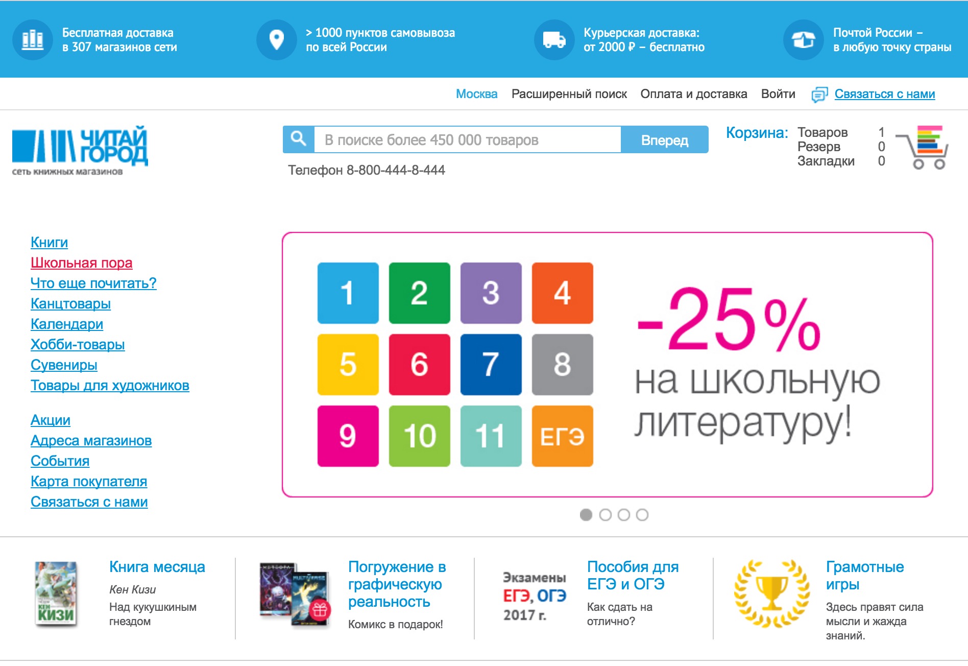 | Промокод на скидку в % | Сайт Читай-город, рассылки, социальные сети, купонные сайты | Минимальная сумма заказа, определенные категории товаров, срок действия |