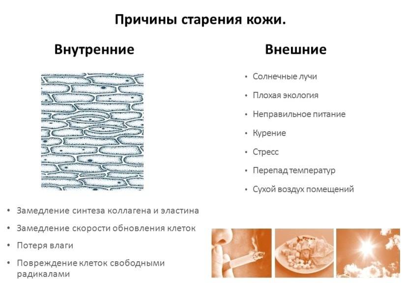 Как и все другие органы нашего организма, кожа подвержена процессу старения. Это явление называется внутренним старением. Старение кожи происходит в результате общего старения организма. Однако внешние факторы оказывают более значительное влияние на состояние кожи, чем внутренние. К основным внешним факторам, способствующим старению кожи, относятся солнечное излучение, гравитация, курение, выражение лицевых эмоций, а также позы во время сна. Наиболее значимым из этих факторов является воздействие солнечных лучей.